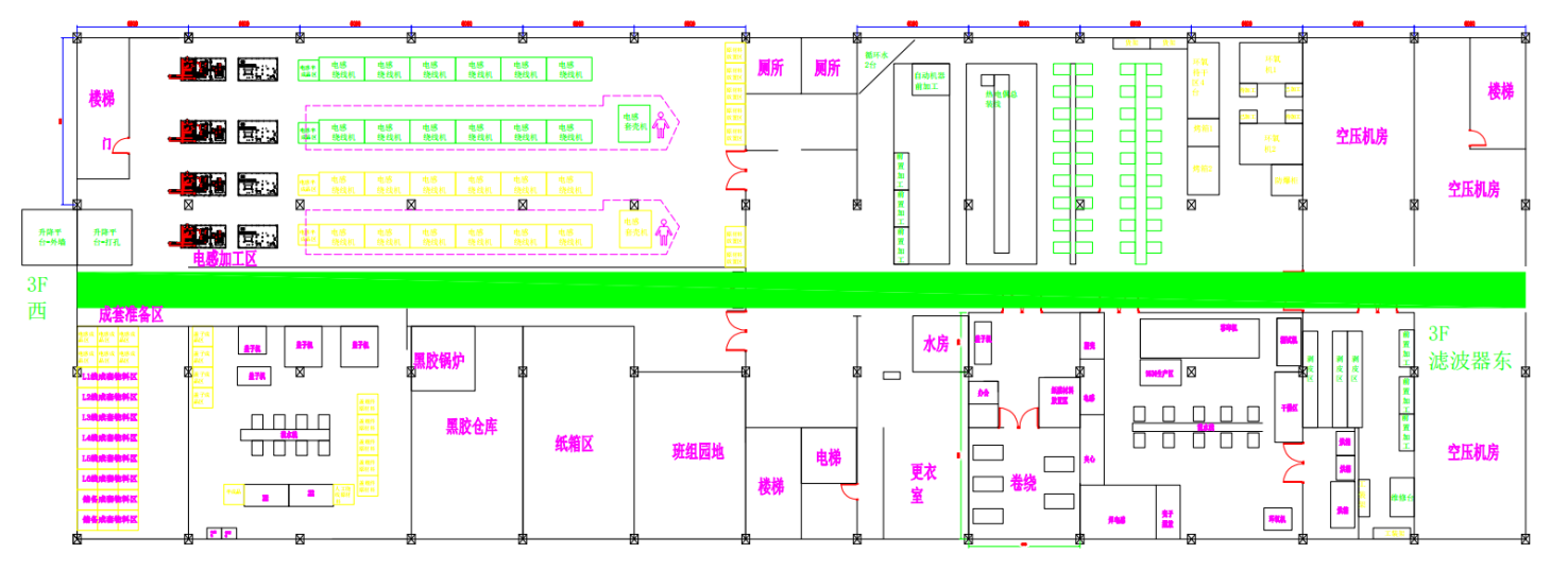 從宏觀層面,考慮整個濾波器生產(chǎn)車間的功能區(qū)域,減少物流搬運(yùn)次數(shù);構(gòu)建連續(xù)流的生產(chǎn)線,導(dǎo)入物流配送系統(tǒng)應(yīng)用ECRS原則、簡易自動化等方法,重新提排布生產(chǎn)線。