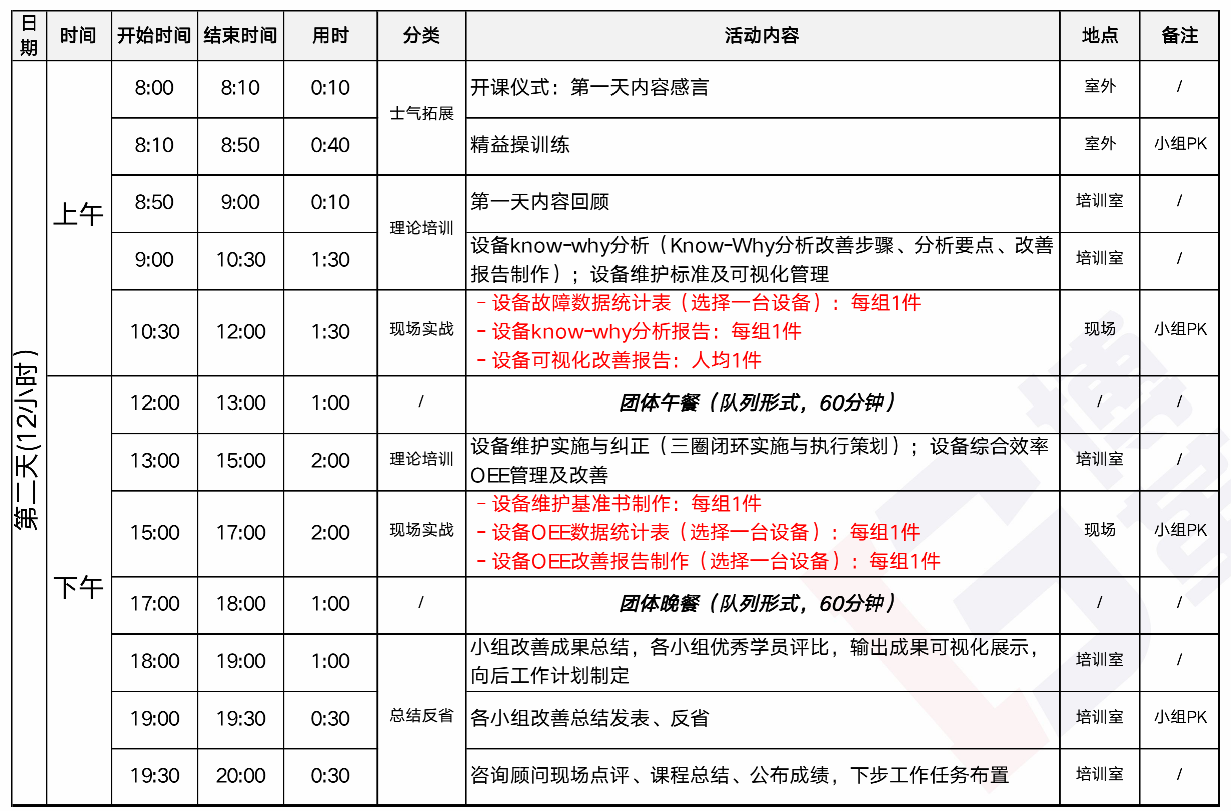 每次培訓(xùn)會(huì)根據(jù)企業(yè)的需求選擇不同的主題,包含但不限于:現(xiàn)場(chǎng)5S、TPM、標(biāo)準(zhǔn)作業(yè)、六源改善、質(zhì)量改善、快速切換、產(chǎn)線平衡、工位布置、浪費(fèi)識(shí)別與改善、QC/IE工具應(yīng)用等