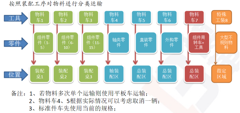 ●搬運浪費:物料運輸過程中,送料員用平板車,需多批次運輸,且需將物料搬運至地面;裝配員再將物料搬運至裝配區;