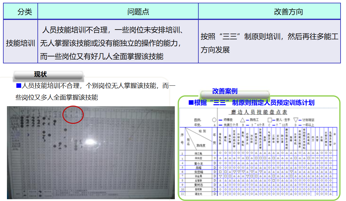 實現一個流生產的目的是降低在制品庫存,使生產中存在的浪費現象暴露出來,并不斷排除,使成本下降,而任何一個問題都會阻礙一個流生產方式的順利進行。順德廣州工廠計劃通過兩方面措施來實現:一是要在沒有庫存的前提下,實現在必要的時刻得到必要的零件,為使各種零件生產和供應同步,統一生產節拍,車間利用作業組合票和偏差調查表工具,發現問題點,并進行整改,著力消除工序內浪費;二是提高過程能力,著力解決排故時間長、信息交流不通暢、工藝紀律差等這些問題,實現作業標準化。