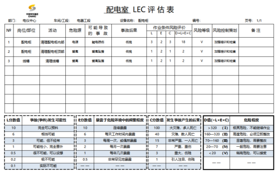 針對六大區域風險特性,引入 LEC 風險評估法,制定分區域《LEC 風險評估表》。評估表按區域每季度更新,同步跟蹤風險管控措施落實效果,實現安全風險動態化管理。