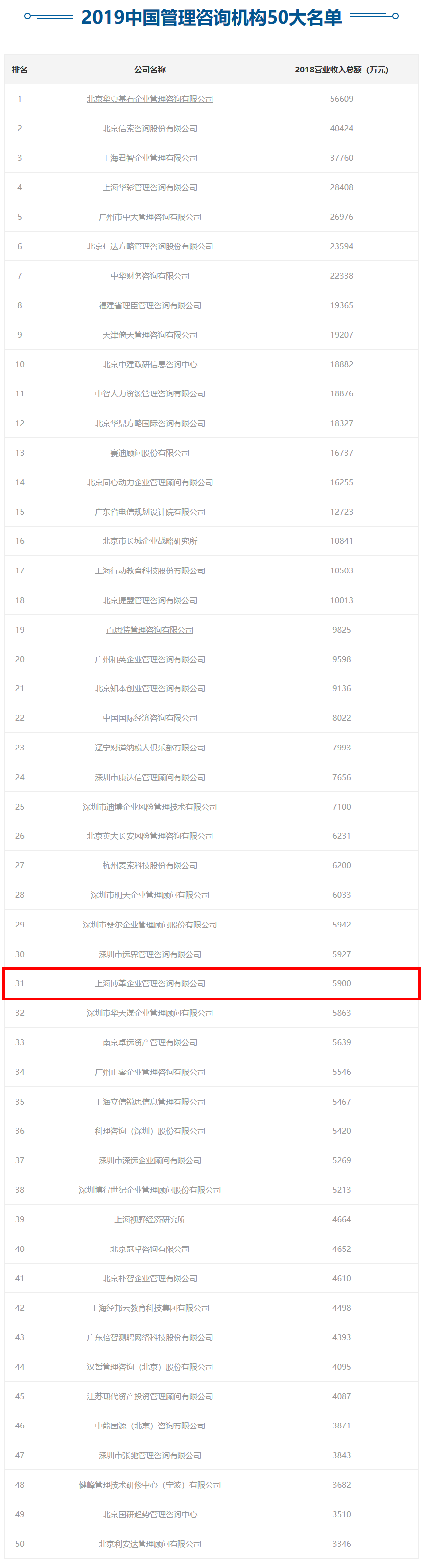 【喜訊】博革咨詢榮登“2019中國(guó)管理咨詢機(jī)構(gòu)50大名單”第31位!