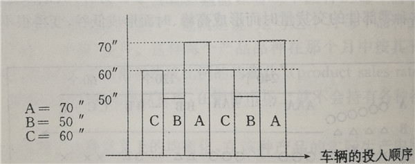 例如,像在圖5.5中看到的那樣,在同一條裝配生產線上某工序的裝配工時產品A是70秒、產品B是50秒、產品C是60秒的情況下,如果按圖中A-B-C一A-B-C的順序流動,在平均節拍時間為60秒的情況下生產線也不會停車,但是像在圖5.6中所看到的那樣,如果所需工時多的產品A成批量演動,在節拍時間為60秒的這條生產線上,作業在節拍時內處理不完,就會發生生產線停車的情況。為了不發生生產線停車,就要像用更短的節拍時間能夠處理70秒高峰作業的產品A那樣,不得不增加人員了。