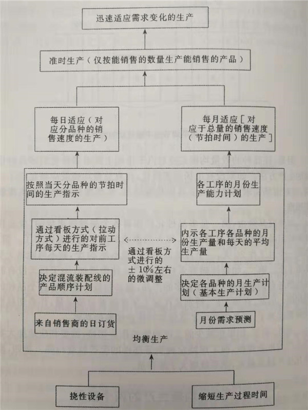 圖1表示了均衡生產的兩個階段。第一階段是適應年度中每個月的需求變化(月份適應),第二階段是適應每個月中每天的需求變化(每日適應)。其中,月份適應要通過月度生產計劃來實現。也就是制定基本生產計劃,按照它來確定并指示該廠各工序每天的平均生產量。這個基本生產計劃,按照每個月的需求預測制定