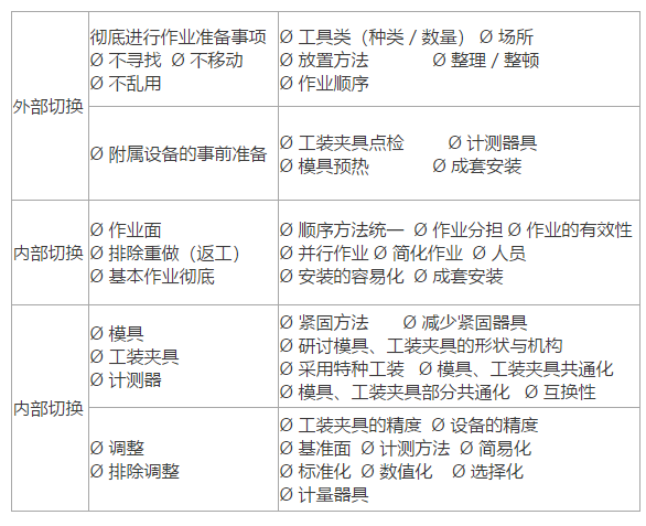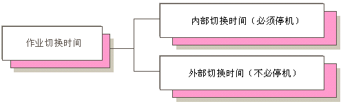 因為要經常變換生產的產品品種,因此在生產流水線的運作過程中,就涉及到品種切換的時間問題。切換動作包括模具、刀具、工裝夾具的切換,組裝生產之零部件、材料的切換,基準變更的切換和制造前的一般準備作業。