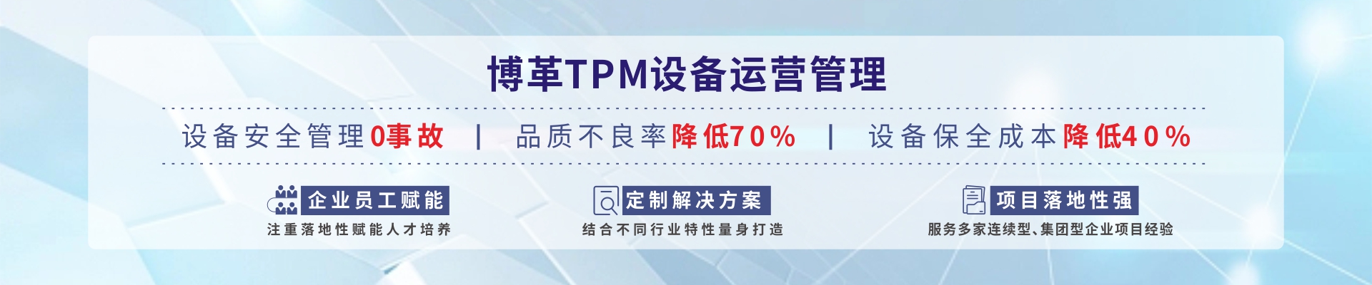 博革咨詢經過20年的發展,為國內外大型集團提供咨詢服務,積累了集團性的項目統計推進經驗。輔導的部分集團公司有:華潤集團、徐工集團、海爾集團、洋河集團、中金嶺南、許繼集團、九陽集團、大全集團、上藥集團、中信集團、中天科技等。 博革咨詢總結出一套適合中國企業的TPM管理模式(包含:設備的前期管理、初期管理、運維管理、技術管理、資產管理、信息化管理等設備全壽命周期管理),使設備有效生產率最高、設備運維費用最低,逐步實現TPM的四個“零”目標。 博革咨詢為眾多的客戶提供TPM咨詢服務過程中,設備的相關指標(設備故障率、設備平均故障間隔期MTBF、設備平均維修時間、設備故障頻次、設備備品備件金額、設備維修費用、設備能源消耗、設備綜合效率OEE等)年度平均改善率達10%~30%,顧問老師深入參與到企業的執行層面,具備“老師”、“教練”、“推進者”三重角色,確保目標達成。 | ![]() |