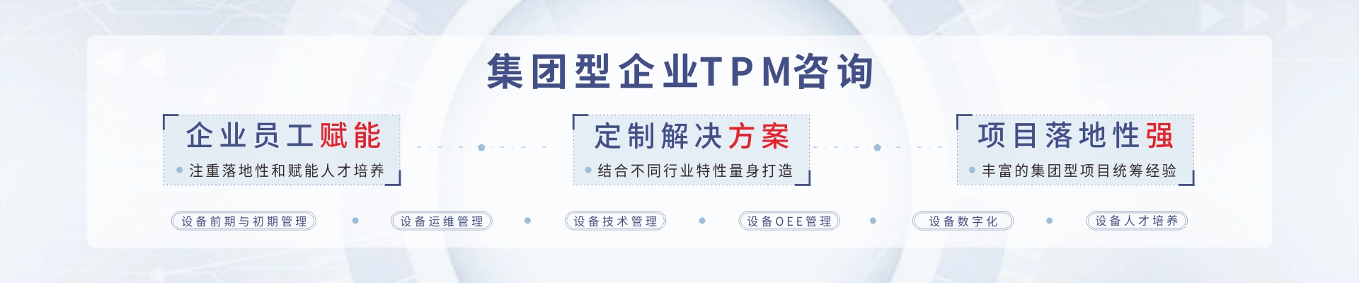 02 具備同行背景、設備專業背景的PM咨詢顧問 與AM咨詢顧問相結合輔導模式 博革咨詢TPM推進采取“自主維護”+“專業維護”雙軌制的模式;PM的咨詢老師具有設備管理專業背景(設備工程師/電氣工程師/二級技師/PLC工程師/中國設備協會會員等),在大型企業設備總監/經理的從業經歷,并具有大型線纜行業經驗,擅長解決設備專業難題;AM的咨詢老師擅長自主維護標準和流程管理,營造全員改善氛圍,提升設備維護技能等。 | ![]() |